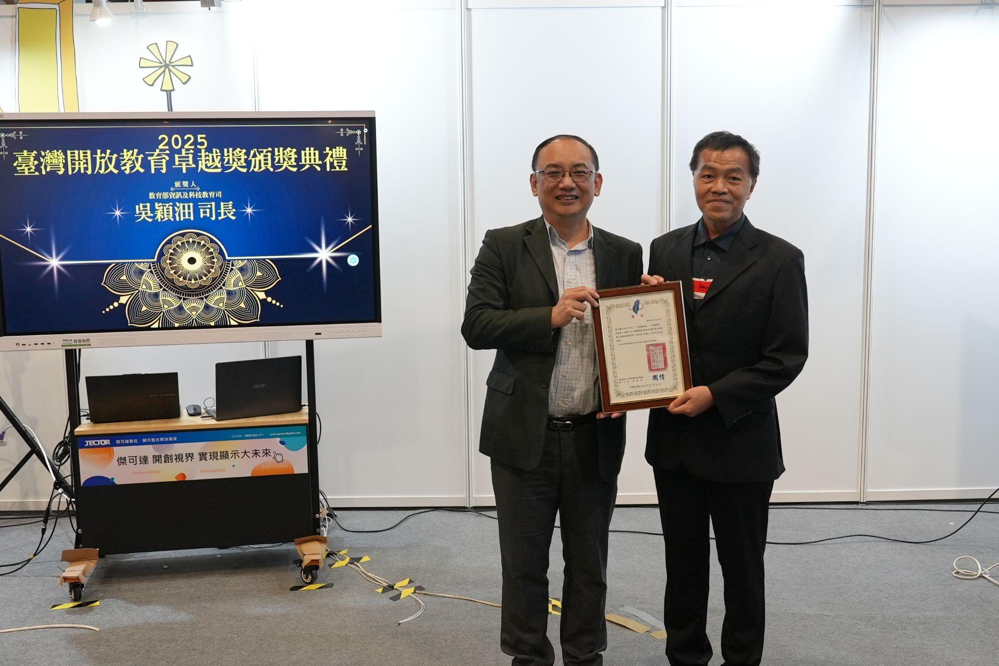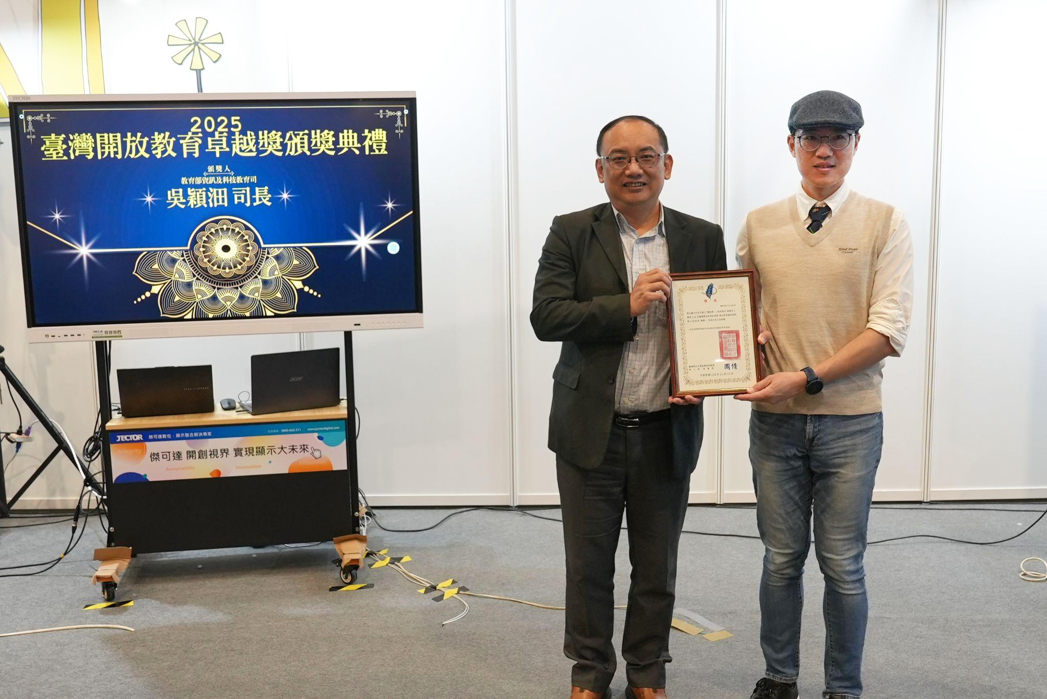在既有成果基礎上,學校今年推薦電子工程系陳晏笙老師及資訊工程系郭忠義老師參加「2025 臺灣開放教育卓越獎」徵選,其《電路學》(註2)與《計算機組織》(註3)課程自全國大專校院作品中脫穎而出,分別榮獲「開放教育優良課程獎–OCW 組」優選,以及「開放教育數位教學資源運用獎–OTB 組」特優,11月15日在台北世貿中心之臺灣教育科技展,由為教育部資科司吳穎沺司長親自頒獎,為北科大在開放教育領域再添亮眼成績。