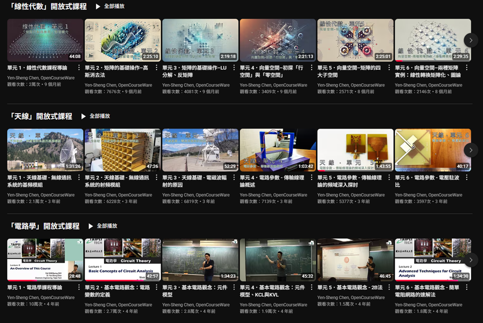《電路學》影片上架 YouTube 後,累積觀看次數已突破 68 萬次,並獲得大量校外學習者正向回饋。依此經驗,陳老師後續又製作《線性代數》《天線》等課程(註5),整體系列教材瀏覽量累積已超過 90 萬次,顯示內容具有高度實用性與擴散效益。