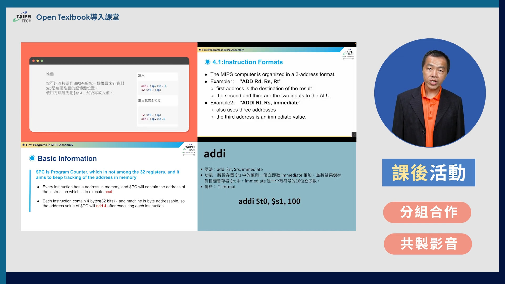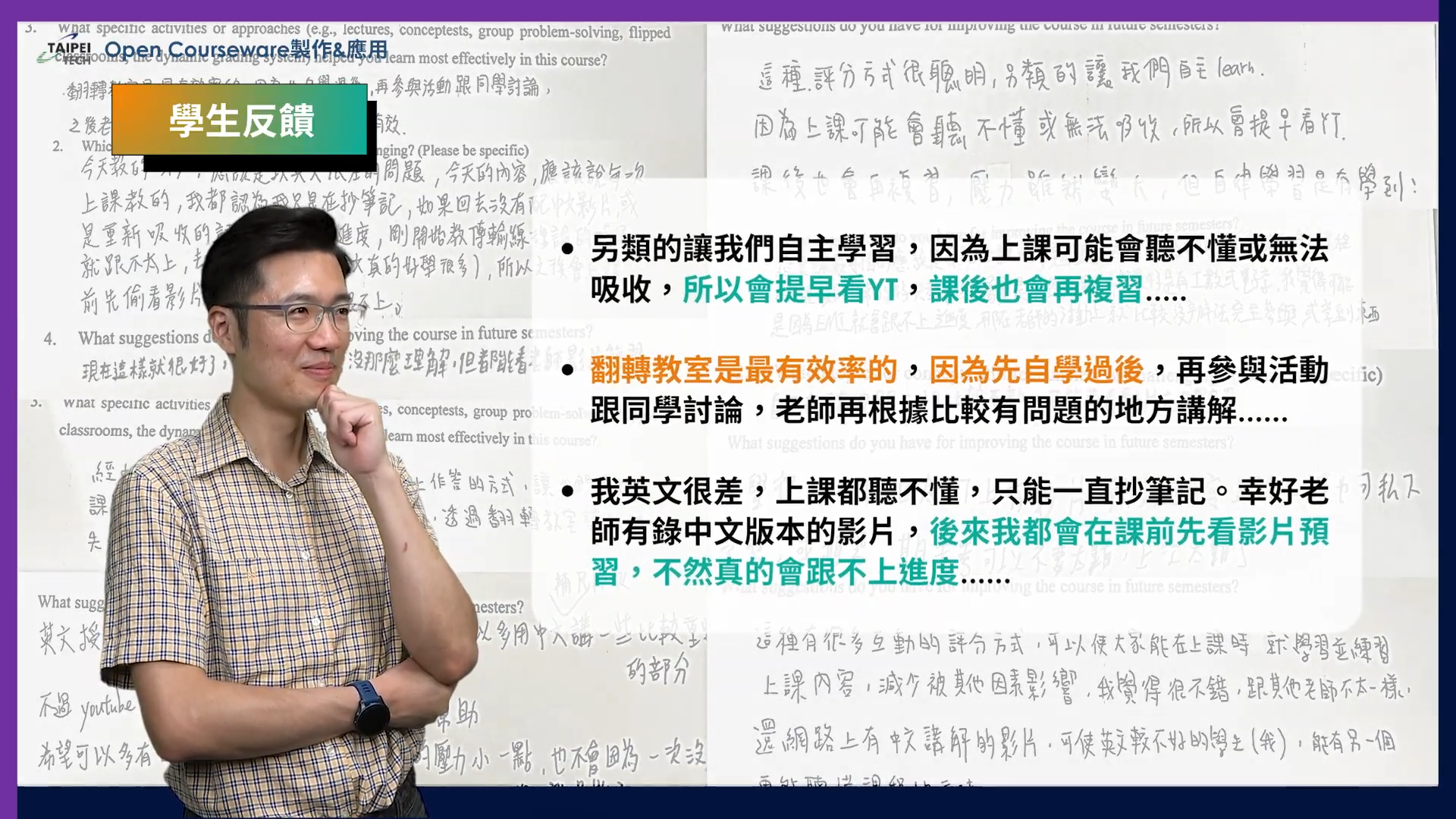 郭忠義老師則是校內最早導入開放教科書(OTB)的教師之一,自 109-2 起,已在 7 門課程中製作並導入 OTB 影音教材,逐步形成「課前自學、課中討論、課後共構」的教學節奏。在《計算機組織》(註6)課程中,學生先透過 OTB 影片預習,課堂再由老師帶領檢核重點、釐清觀念;課後則由學生小組製作簡報與影片,參與教材「共創」。這樣的設計不僅幫助學生學得更扎實,也實踐 OER 可改編、可再利用的核心精神。