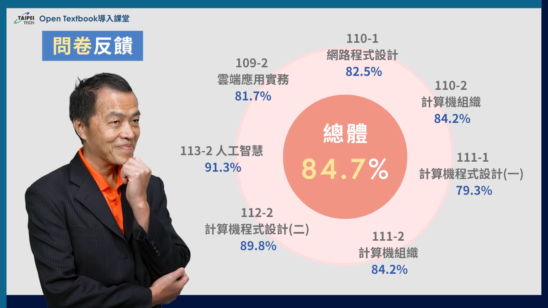 | 郭忠義老師的七門OTB應用課程,學生滿意度整體達 84.7% | 郭忠義老師展示由《計算機組織》課程學生共構的OTB教材畫面 |
